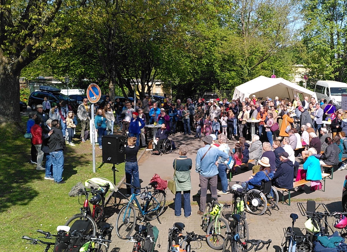 Ein großer Tag für unser Projekt: Bei strahlendem Sonnenschein legen wir den Grundstein! Rund um unser Festzelt auf dem Parkplatz am Forster Weg tummeln sich rund 200 Menschen aus Genossenschaft und Nachbarschaft, von Baufirmen und Partnerorganisationen sowie aus Politik und Verwaltung. Einige Kinder, die zukünftig bei uns wohnen werden, füllen eine „Zeitkapsel“ mit wichtigen Dokumenten, der aktuellen Tageszeitung und einem Beutel mit Münzen. Die Kapsel wird bei Gelegenheit auf der Baustelle „verbuddelt“ werden. Wir danken allen Beteiligten und Gästen für das gelungene Fest! (Foto: Siegbert Gossen)